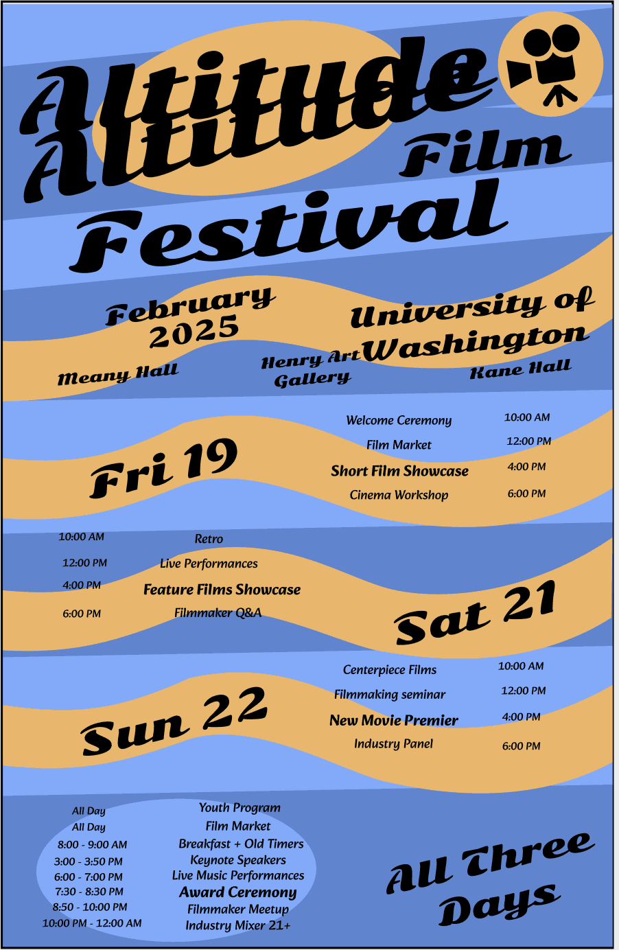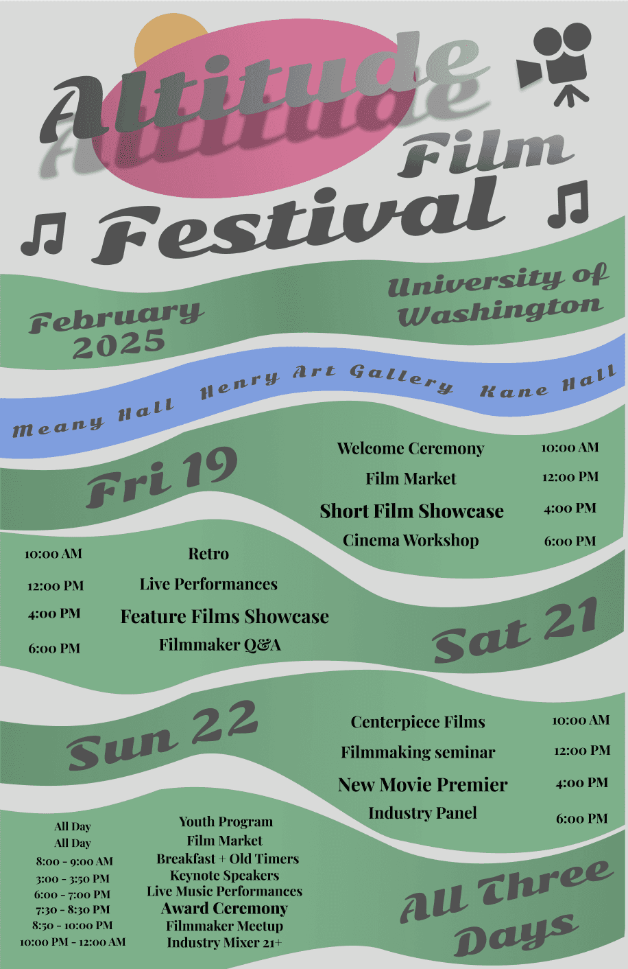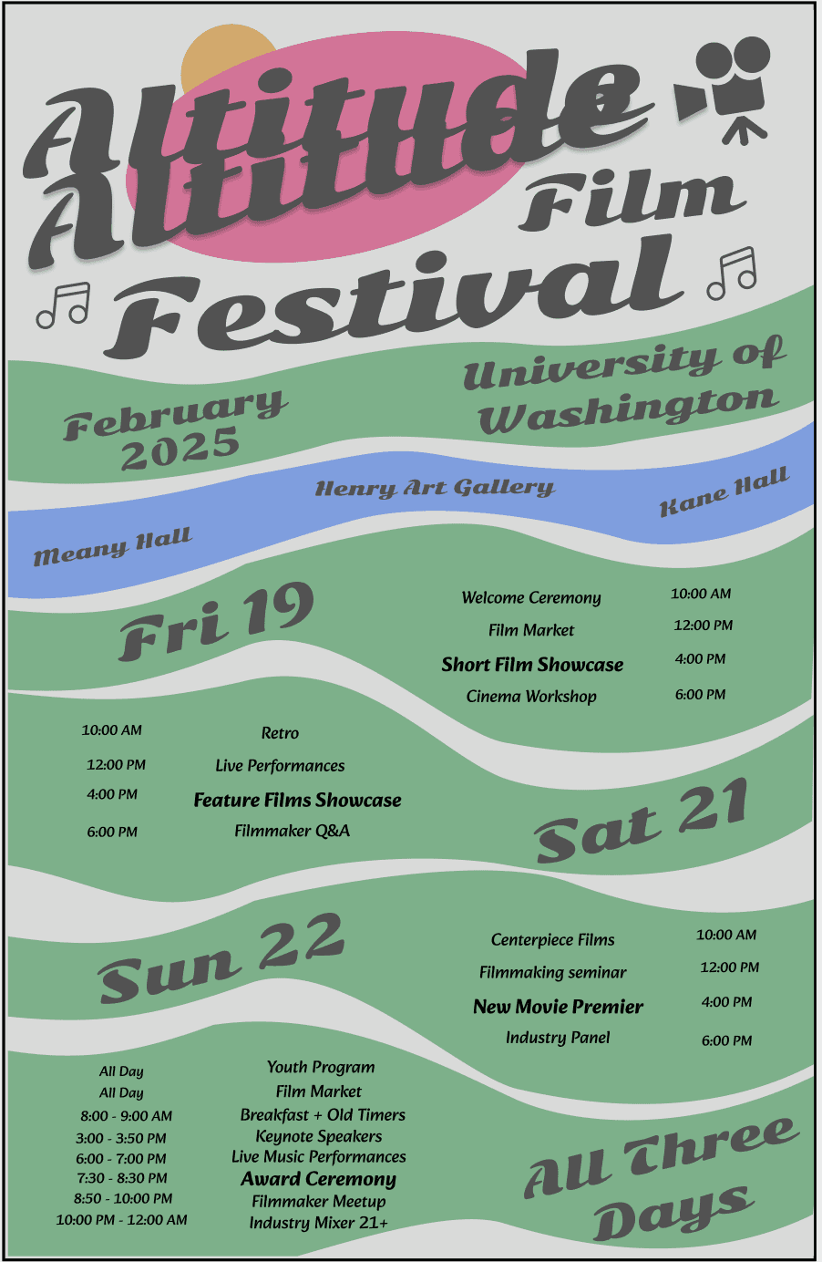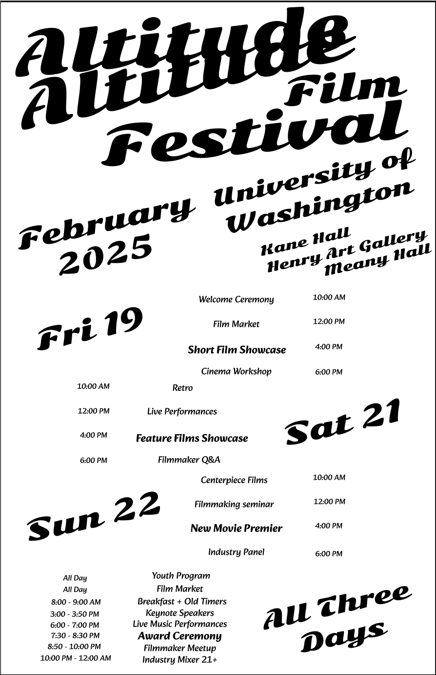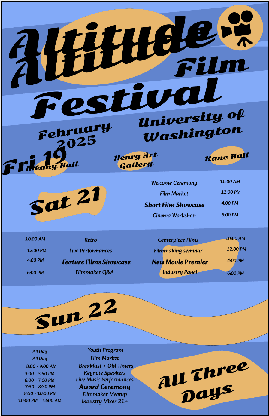 This project documents my ten-week process developing a visual system for the University of Washington’s “Altitude Film Festival”—a three-day event celebrating the interplay between music and cinema. The festival spotlights local musicians and filmmakers through creative, low-budget screenings and performances, offering a look into how a cohesive festival campaign comes together.