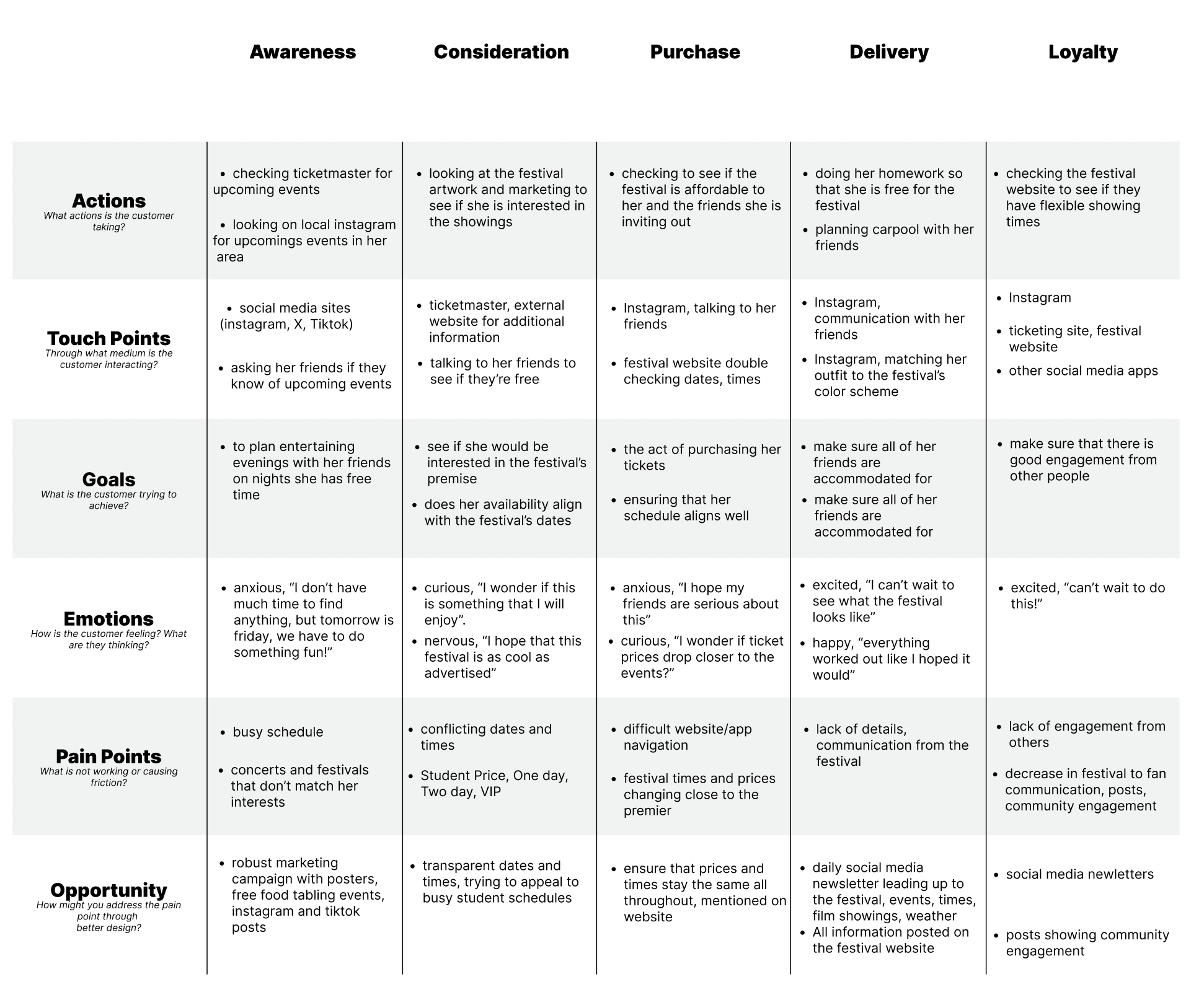 I selected Vanessa as the persona for this customer journey because she best reflects the core audience for this festival. Since the event is targeted toward UW college students, her background and interests align closely with the typical festival attendee.