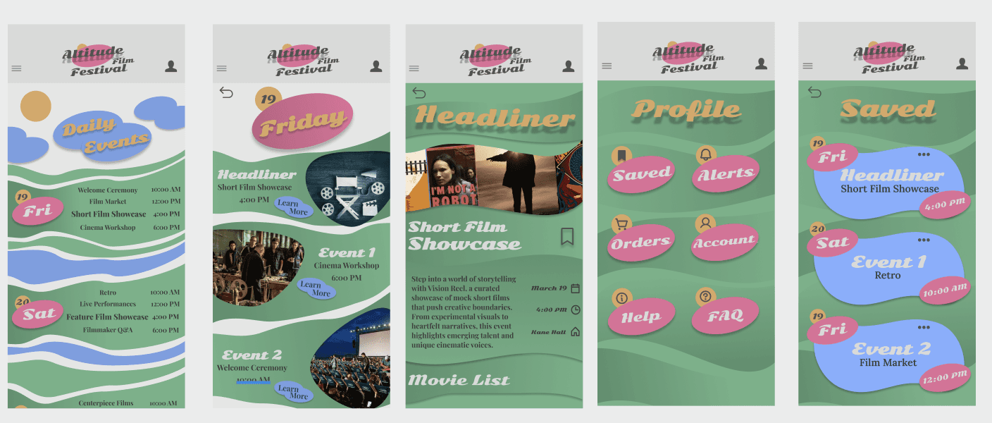 I carried over several key elements from my poster into the mobile interface, including shapes, color palette, typography, and a consistent grid system that keeps all content and graphics aligned. I also introduced playful interactive components, such as cloud-shaped buttons and saved-bookmark visual elements.