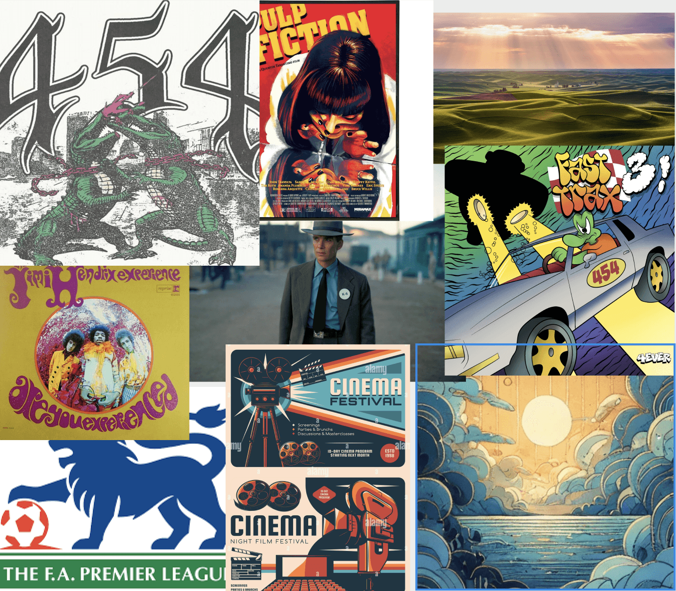 These images inspired my initial designs because they exemplified certain elements of color combination, information organization, creativity, or distinctiveness. Fast Trax 3, Hendrix, and Pulp fiction all included color schemes that appealed to me and had an interesting use of perspective. 454 is where I drew inspirational for my festival colors as I was a big fan of how the colors complimented each other on the off-white canvas. The rolling hills and the sunset were both my initial inspirations when trying to find a color scheme to my festival as I wanted to represent “Altitude” through a depiction of hills and a vibrant sunset.