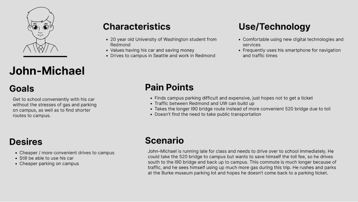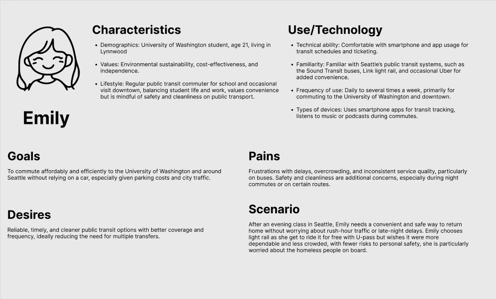 We conducted six interviews to understand the specific needs and preferences of our target user group. Our research aimed to explore why individuals opt to drive instead of utilizing public transportation, identify primary concerns about existing transit options, and uncover factors influencing users' transportation choices. Through these interviews, we found recurring themes such as convenience, cleanliness, safety, punctuality, and ease of access to transportation information. Participants frequently expressed concerns regarding delays, safety issues, and uncomfortable conditions on buses, whereas the reliability and punctuality of the Link light rail were viewed more positively. These insights gives us an understanding on the pain points of public transportation and allow us to develop our personas to conduct deeper research.